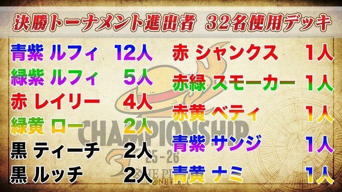 そして、赤シャンクス、赤緑スモーカー、赤黄ベティ、青紫サンジ、青黄ナミも、それぞれ1名ずつが決勝ラウンドへと進出。環境の多様性を象徴するような結果となりました。