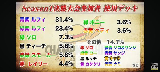 - その他、14.7%の中には、黒ルッチ、青紫サンジ、緑黄ローといった多様なリーダーがひしめきあっています。これらのデッキが、どのような活躍を見せるのか、目が離せません。