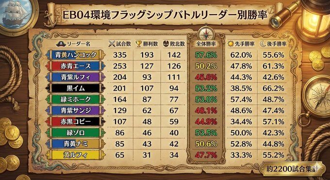 ONE PIECEカードゲームのEB04環境が幕を開けました。本稿では、フラッグシップバトルの約2200試合におよぶ集計データを基に、現在のメタゲームを客観的な数値から分析します。