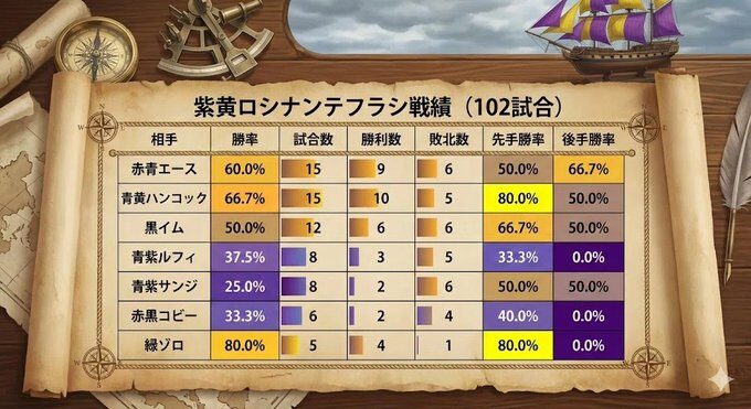 ただし、弱点も明白です。青紫サンジ(勝率25.0)%、青紫ルフィ(勝率37.5%)といった、青紫という色の組み合わせを持つリーダーに対しては、相性が悪い傾向があります。
